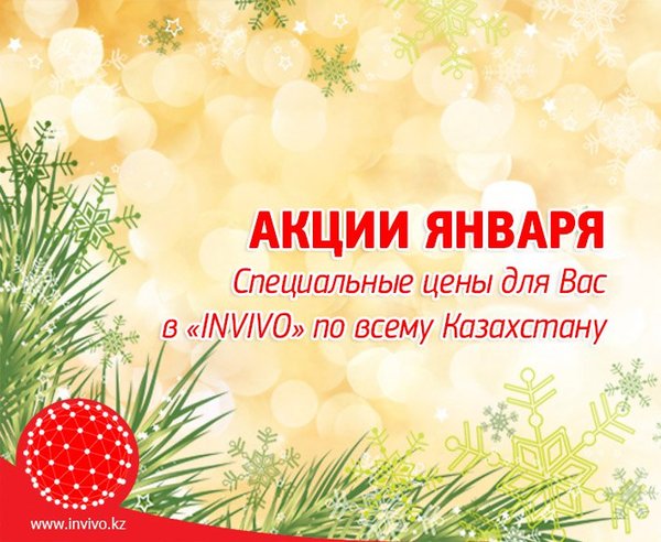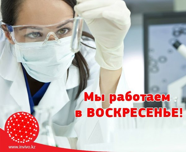 Дорогие друзья! Искренне желаем Вам здоровья в наступающем 2016-м году! Доводим до вашего сведения, что: Приемные пункты «Invivo» в Алматы и Алматинской обл. работают 29, 30, 31 декабря с 8:00 до 13:00. С 1 по 3 января выходные дни. Приемные пункты «Invivo» в регионах работают 29, 30 декабря с 8:00 до 13:00. С 31 декабря по 3 января выходные дни. Подробнее -> #Инвиво. С заботой о вашем