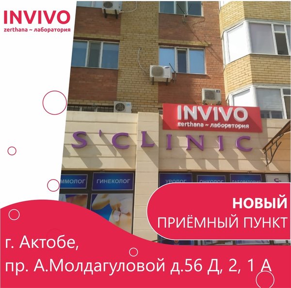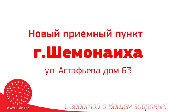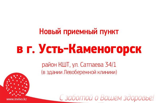 ып, талдауды тапсыру, өз денсаулығыңыздың жағдайын бақылау енді әлдеқайда ыңғайлы! Мекенжайы: Сатпаев көшесі 34/1 үй Қабылдау пункті туралы толық ақпарат: Инвиво. Сіздің денсаулығыңызға деген қамқорлықпен
