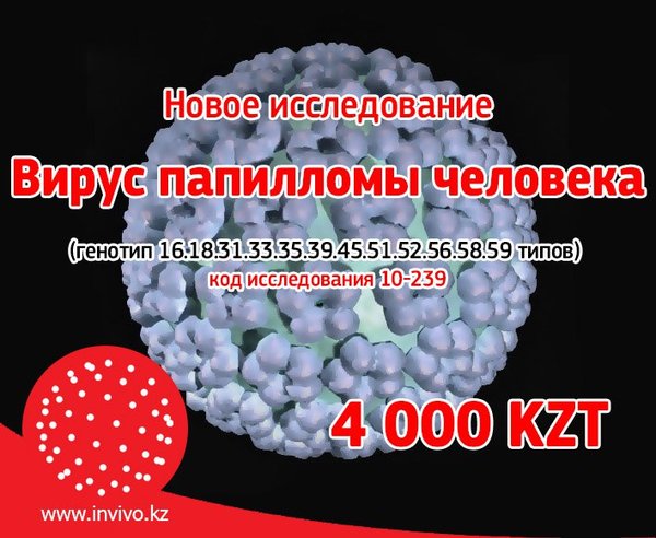 Дорогие коллеги, пациенты! Запущено исследование на определение типа вирусов папилломы человека — данное исследование включает 12 типов (16,18,33,31,35,39,45,51,52,56,58,59). Метод исследования: ПЦР Стоимость исследования: 4 000 KZT Срок готовности: до 7 дней (с даты постановки). Подробнее об исследовании -> Надеемся, что данное исследование поможет в правильном определении диагноза. #Инвиво. С заботой о вашем