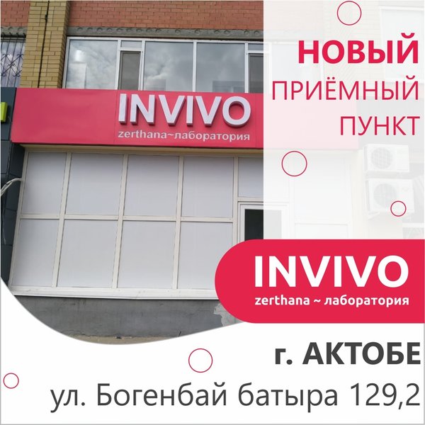 Открылся приёмный пункт в городе Актобе! ⠀ Ждём вас по адресу: г. Актобе, ул. Богенбай батыра, 129, корпус 2 ⠀ ⏰График работы: Пн-Пт 7.30—15.30, Сб 8:00 -13:00 ⠀ Напоминаем, что большинство исследований сдается натощак до 11:30 ⠀ Забор биоматериала оплачивается отдельно — 550 тг. __ INVIVO — сеть лабораторий в Казахстане — 5% бонусов на накопительную карту -10% скидки при оплате банковской картой на сайте