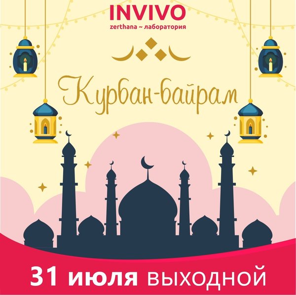 Друзья! Поздравляем со священным праздником Курбан-айт! Пусть в вашем доме всегда царит мир. Напоминаем, что 31 июля праздничный выходной день. 1 августа приёмные пункты работают согласно стандартному графику __ INVIVO — сеть лабораторий в Казахстане — 5% бонусов на накопительную карту
