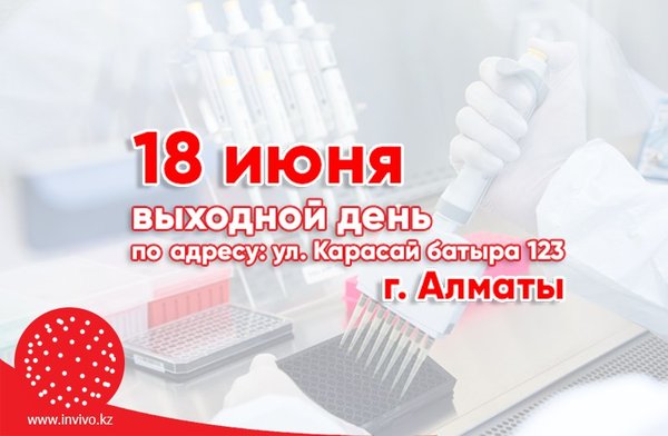 ься с графиком работы приемных пунктов лаборатории «INVIVO» в праздничные дни: 11 и 12 сентября — выходные дни. В остальные дни приемные пункты работают в обычном режиме. Информацию о сдаче анализов в предпраздничные дни уточняйте в кол-центре по номеру 258 83 83. С уважением, Лаборатория #INVIVO. ------------------------------------------------------------- Құрметті достар! Баршаңызды айтулы мереке Құрбан айт мейрамымен шын жүректен құттықтаймыз! Бұл мейрам ұлт пен ұлысты ұйыстыратын рухани ұлы құндылықтардың бірі. Құрбан айт мейрамының жамағат арасындағы бірлікті күшейтіп, бауырластықты арттырудағы рөлі аса зор. Жаратушы иеміз сүйікті Қазақстанымыздың мерейін үстем етіп, халқымыздың ауыз бірлігін арттыра бергей! Қаламың карымды, еңбегің арынды, денсаулығың зор бола беруіне тілектеспіз! Әрбір отбасына бақыт, береке қонғай! Көп ұлт пен ұлысты Отанымызға бірлік пен ынтымақ бергей! Мейрам күндері INVIVO зертханасының қабылдау пунктілерінің жұмыс кестесімен танысуды ұсынамыз: 11 мен 12 қыркүйек демалыс күндері. Қалған күндері қабылдау пунктілері әдеттегідей жұмыс істейді. Мейрам қарсаңындағы күндері талдауларды тапсыру туралы ақпаратты 258 83 83 нөмірі бойынша кол-орталығында анықтаңыз. Ізгі құрметпен, INVIVO зертханасы