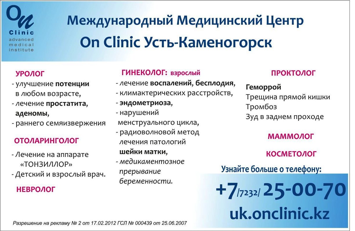 Международный медицинский центр On clinic располагается по адресу Казахстан, Усть-Каменогорск, Набережная Славского, 64/1.