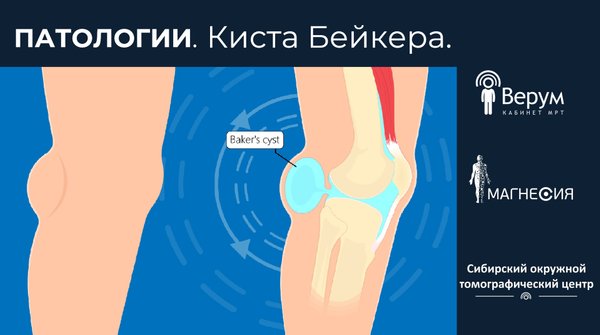 е распространенным среди всех доброкачественных полостных синовиальных образований вокруг коленного сустава. Эта патология носит имя английского хирурга У.М. Бейкера, который в 1877 году описал классический случай заболевания. Симптомы заболевания. Кисты Бейкера чаще всего обнаруживаются случайно при визуализации коленного сустава по другим причинам. Симптоматика появляется, когда киста начинает увеличиваться в размерах. Проявления могут быть следующие: • ощущение скованности в коленном суставе; • припухлость в подколенной ямке; • боль в колене и/или подколенной ямке. Ощущения могут беспокоить как при движении, так и в состоянии покоя. Причины развития кисты Бейкера. Считается, что киста Бейкера является следствием сообщения между капсулой сустава задних отделов коленного сустава и икроножно-полуперепончатой сумкой, с дальнейшим растяжением последней. При этом есть теория присутствия одностороннего эффекта движения синовиальной жидкости из капсулы сустава в подколенную сумку при сгибании сустава. Кроме того, выпот в колене при воспалительных и дегенеративных артропатиях, вызывает вытеснение жидкости из задних отделов сустава в соответствующую сумку. Иногда киста подколенной ямки может возникнуть на фоне внутрисуставных нарушений, таких как: • разрывы мениска; • дегенеративные и воспалительные изменения коленного сустава (артрозы, артриты); • повреждение сухожильно-связочного аппарата. Осложнения кисты Бейкера. При длительно существующей кисте Бейкера возможны осложнения, которые включают в себя: • диссекцию — расслоение кисты, обычно поражаются нижние отделы; • разрыв — сопровождающийся вытеканием жидкости из кистозной полости в межфасциальное (межмышечное) пространство задней поверхности колена и/или голени; • компрессия — воздействие кисты на подколенные сосуды и нервы. Диагностика подколенных кист. Магнитно-резонансная томография на сегодняшний день является наиболее надежным и высокоинформативным методом обнаружения кисты Бейкера, которая также позволяет оценить весь спектр патологий, связанных с кистой, таких как — разрывы мениска, повреждения хрящевого покрытия и сухожильно-связочного аппарата, артрозы и артриты. ️ В РФ ️ В Казахстане