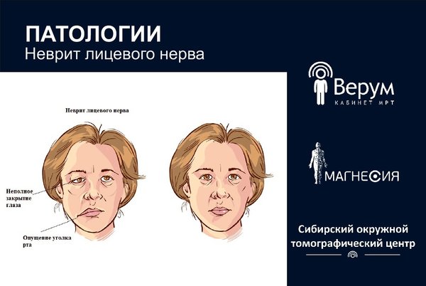 ена теория вирусной этиологии заболеваний. К вирусам, последствиям развития лицевого неврита, относятся различные герпесвирусы, вирус иммунодефицита человека (ВИЧ). Помимо этого, у паралича Беллы у болезни Лайма мог возникнуть саркоидоз. Также определяются некоторые предрасполагающие факторы: беременность, сахарный диабет, возраст (чем выше, тем больший риск), гипотиреоз, особенности анатомии (узкий внутренний слуховой проход, по которому проходит лицевой нерв). Симптомы паралича Белла При параличе Белла первым симптомом может быть боль за ухом. Слабость лицевых мышц наступает внезапно, обычно в течение нескольких часов, нарастает в течение 48—72 часов и затем не прогрессирует. Поражение распространяется только на половину лица, из-за того лицо выглядит асимметричным. Также наблюдаются следующие симптомы: опущение уголка рта; сглаживание носогубной складки; затруднение с выражением эмоций (сложно сморщить лоб, улыбнуться); невозможность полностью закрыть глаз на пораженной стороне и, как следствие, сухость и раздражение глаза; сухость во рту; трудности с произношением слов; затруднение при приеме пищи и питье; искажение вкуса; повышенное слюнотечение; повышенная чувствительность к звукам; нервные подергивания в области лица; головная боль. Диагностика В первую очередь врач-невролог собирает анамнез, проводит клинический осмотр – отмечает асимметрию лица и другие симптомы. Затем назначает дополнительные методы исследования, которые могут включать: Электронейромиографию (ЭМГ) — метод оценки состояния периферической нервной системы и скорости нервно-мышечной передачи, с ее помощью оценивается тяжесть заболевания, дается прогноз. МРТ головного мозга с контрастированием – позволяет оценить структуру нерва от ствола головного мозга до дна внутреннего слухового прохода, при параличе Белла в 57—100% случаев будет наблюдаться накопление контрастного препарата на уровне цистернального, интраканаликулярного и лабиринтного сегментов лицевого нерва на стороне поражения (в норме данные сегменты не накапливают контрастный препарат), также может наблюдаться утолщение пораженного нерва. Однако, в первую очередь, проведение МР-исследования необходимо, чтобы исключить иную патологию, которая могла вызвать подобные симптомы (инсульт, образования, непосредственно вовлекающие или оказывающие объемное воздействие на лицевой нерв или нейроваскулярный конфликт). Для прицельной визуализации черепно-мозговых нервов используется специализированный режим сканирования (CISS/FIESTA). Для оценки контактирования цистернального сегмента лицевого нерва с сосудами (диагностики нейроваскулярного конфликта) необходимо проходить исследование с МР-ангиографией. КТ височной кости — полезна для выявления костных аномалий. Анализы крови. Рентген грудной клетки (при подозрении на саркоидоз). Прогноз Прогноз при параличе Белла, как правило, хороший: 70—90% пациентов полностью выздоравливают в течение 6—8 недель (более высокий процент полного выздоровления — при своевременной консервативной терапии). В РФ В Казахстане Каменогорск