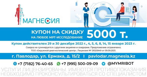 Дорогие пациенты! Предлагаем начать Новый 2023 год со здоровья. Воспользуйтесь купоном на 5000 тенге, чтобы пройти МРТ головного мозга, артерий, позвоночника, суставов или других органов и систем. Акция действует при предъявлении SMS-сообщения, бумажного купона или скриншота этого баннера (возможен любой вариант, на выбор). Купон действителен на обследования, проводимые в следующие даты: 4 января 2023 г.; 5 января 2023 г.; 6 января 2023 г.; 8 января 2023 г.; 14 января 2023 г.; 15 января 2023 г. Скидка не суммируется с другими акциями… — Читать дальше