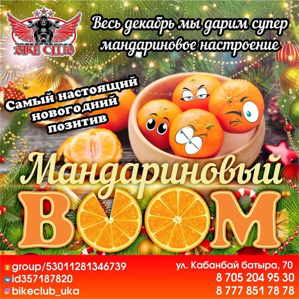 Какие у вас ассоциации с новым годом? Запах елки и мандаринов? У нас такие же) Приходи к нам- весь декабрь мы дарим сумасшедшее мандариновое настроение КАЖДОМУ BIKE CLUB г.Усть-Каменогорск, Кабанбай Батыра,70 Работаем БЕЗ ВЫХОДНЫХ с 18:00—06:00 с пн-чт до 23:00 вход свободный! —---------------------------------------------------------------------