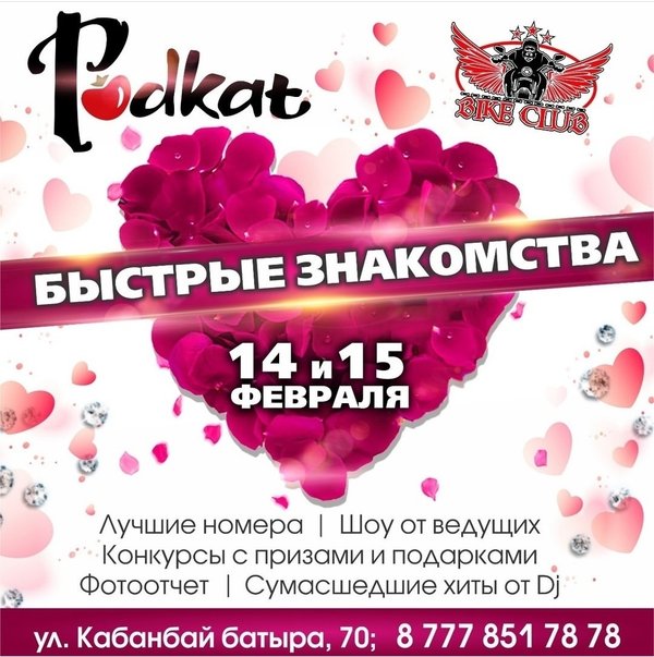 Любовь, поверь, не просто слово, Оно живёт в моей душе, От чувства нежного, простого, Сердца пылают на Земле. 14 и 15 февраля встретим вместе самый романтичный праздник года! Для Вас зажигательные конкурсы с призами и подарками, проф.фото, лучшие хиты, шоу от ведущих, лучшие номера! Ждем Вас в нашем клубе! Мы Вас ЛЮБИМ BIKE CLUB г.Усть-Каменогорск, Кабанбай Батыра,70 Работаем БЕЗ ВЫХОДНЫХ с 18:00—06:00 с пн-чт до 23:00 вход свободный! ⠀---------------------------------------------------------------------