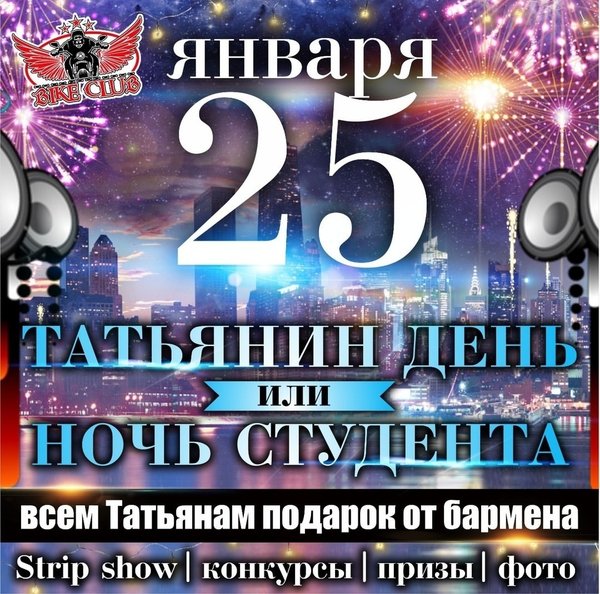 Приглашаем на супер-мега-крутую ВЕЧЕРИНКУ! 25 января ТАТЬЯНИН ДЕНЬ или НОЧЬ СТУДЕНТА!!!! Вас ждут классные подарки, сумасшедние конкурсы, зажигательные танцы, профессиональные фото и ПОДАРОК ВСЕМ ТАТЬЯНАМ ОТ БАРМЕНА! BIKE CLUB г.Усть-Каменогорск, Кабанбай Батыра,70 Работаем БЕЗ ВЫХОДНЫХ с 18:00—06:00 с пн-чт до 23:00 вход свободный!