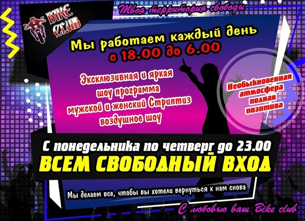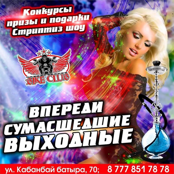 Приходите к нам в клуб!!! Мы вас научим, как нужно отрываться!!!! BIKE CLUB г.Усть-Каменогорск, Кабанбай Батыра,70 Работаем БЕЗ ВЫХОДНЫХ с 18:00—06:00 с пн-чт до 23:00 вход свободный! —---------------------------------------------------------------------