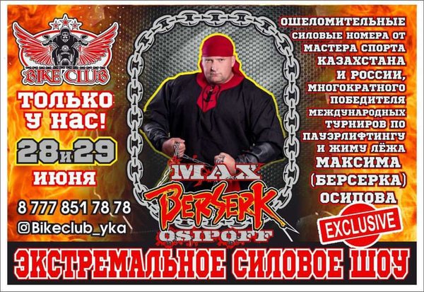 ЭТО ПРОСТО ПОЖАР! 28 и 29 июня только в нашем клубе ЭКСТРЕМАЛЬНОЕ СИЛОВОЕ ШОУ! ТЫ ОБЯЗАН ЭТО УВИДЕТЬ! Только настоящие мужчины! Только ХАРДКОР! Только СИЛА! BIKE CLUB г.Усть-Каменогорск, Кабанбай Батыра,70 Работаем БЕЗ ВЫХОДНЫХ с 18:00—06:00 с пн-чт до 23:00 вход свободный!