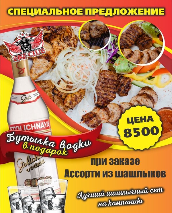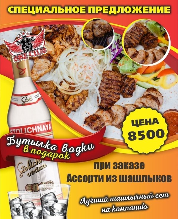 СПЕЦИАЛЬНОЕ ПРЕДЛОЖЕНИЕ для наших любимых гостей! Закажи САМЫЙ классный шашлычный сет и получи бутылочку беленькой В ПОДАРОК! BIKE CLUB г.Усть-Каменогорск, Кабанбай Батыра,70 Работаем БЕЗ ВЫХОДНЫХ с 18:00—06:00 с пн-чт до 23:00 вход свободный! ⠀---------------------------------------------------------------------
