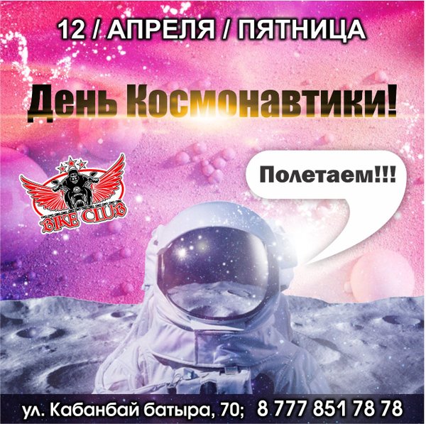 Приглашаем на самую УЛЕТНУЮ вечеринку! Сегодня, 12 апреля, в пятницу, ждём тебя и твоих друзей в наш клуб! Тебя ждёт космическая шоу-программа, море вкусняшек на баре, зажигательные треки и умопомрачительные ведущие вечера! Целых 2 этажа сумасшедшего отрыва! Приходи и будь в центре событий! BIKE CLUB г.Усть-Каменогорск, Кабанбай Батыра,70 Работаем БЕЗ ВЫХОДНЫХ с 18:00—06:00 с пн-чт до 23:00 вход свободный!