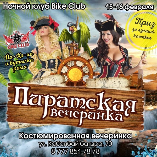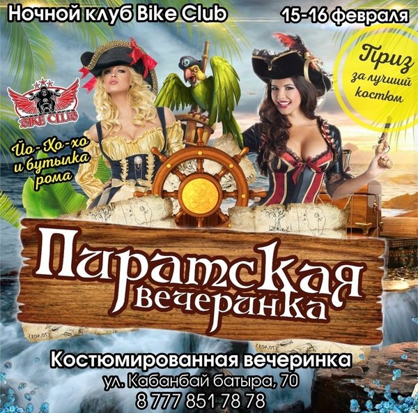 Разрази меня гром! 15 -16 февраля безудержная ПИРАТСКАЯ ВЕЧЕРИНКА! Абордажные клинки оголить! Океан веселья, смеха, сумаседших танцев и ПРИЗ ЗА ЛУЧШИЙ КОСТЮМ!!! Ждем Тебя! Локация- Ночной клуб Bike Club BIKE CLUB г.Усть-Каменогорск, Кабанбай Батыра,70 Работаем БЕЗ ВЫХОДНЫХ с 18:00—06:00 с пн-чт до 23:00 вход свободный! ⠀---------------------------------------------------------------------