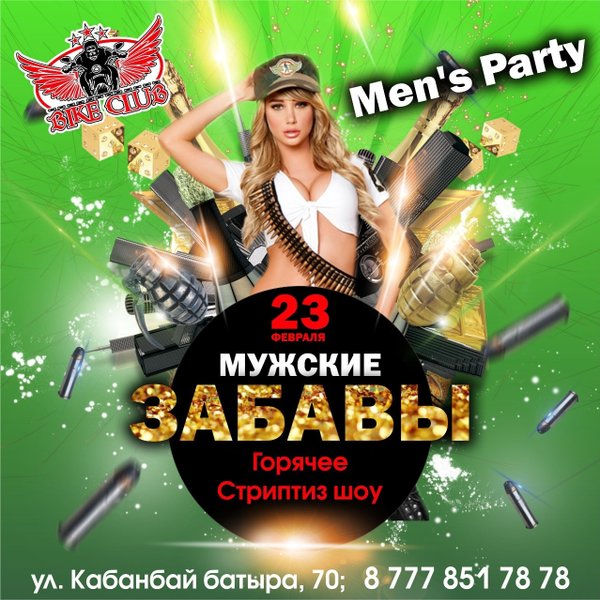УХХХ что будет! 23 ФЕВРАЛЯ в самый мужской праздник в году! Зажигательная шоу-программа! МУЖСКИЕ ЗАБАВЫ! Горячее стриптиз-шоу, просто улетная вечеринка! Гарантируем разные разности! BIKE CLUB г.Усть-Каменогорск, Кабанбай Батыра,70 Работаем БЕЗ ВЫХОДНЫХ с 18:00—06:00 с пн-чт до 23:00 вход свободный!