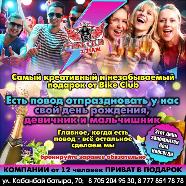 У вас день рождения? Девичник или мальчишник? Корпоратив? Или просто хочется устроить с друзьями мега-тусу? ВЕЛКАМ в наше клуб — тут есть все для ИДЕАЛЬНОЙ ПАТИ! BIKE CLUB г.Усть-Каменогорск, Кабанбай Батыра,70 Работаем БЕЗ ВЫХОДНЫХ с 18:00—06:00 с пн-чт до 23:00 вход свободный!