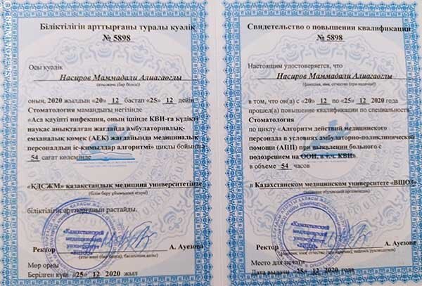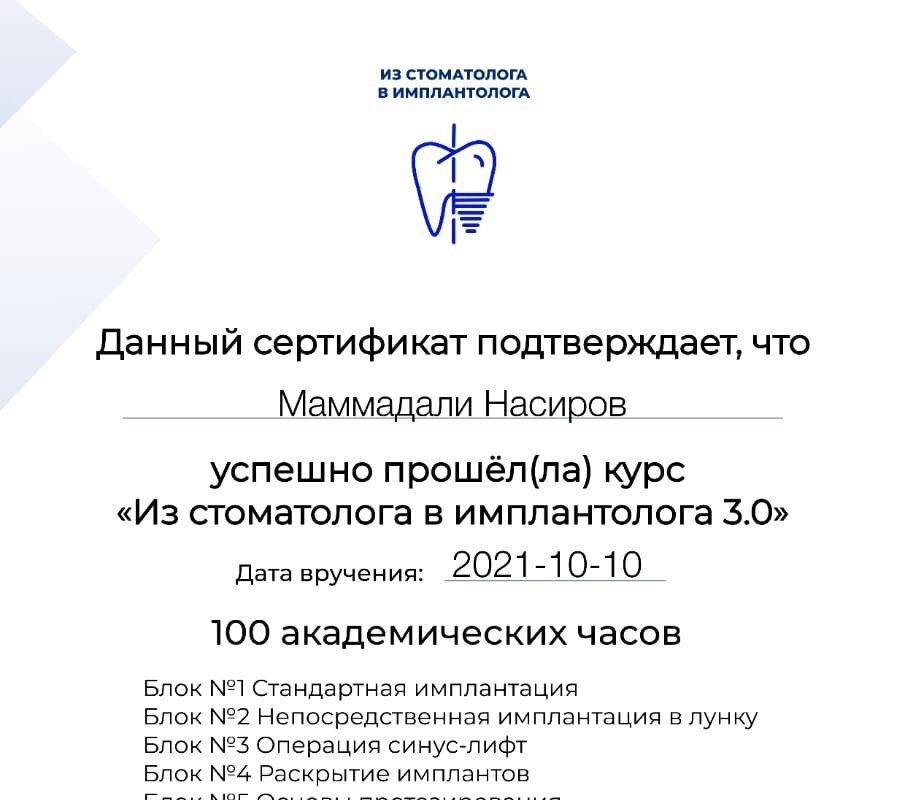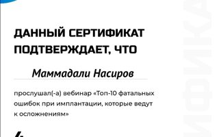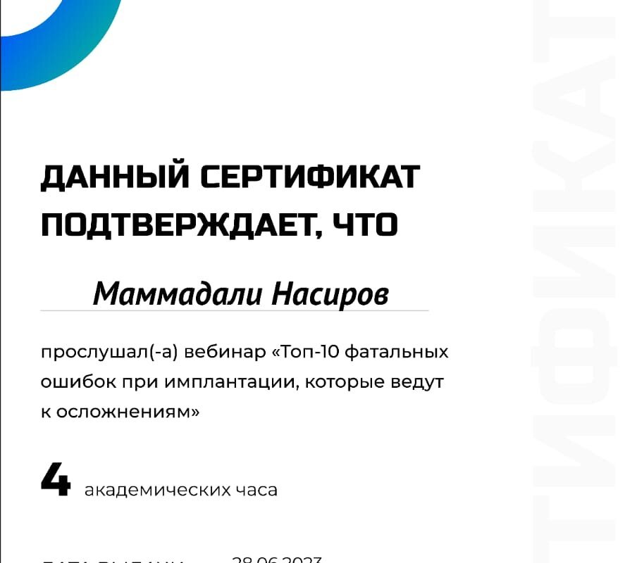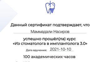 Профессиональное развитие доктора Насирова включает участие в ряде престижных курсов и тренингов. ОнполучилобучениевИзраилепопрограмме "DENTAL IMPLANTOLOGY: FROM THEORETICAL TO PRACTICAL KNOWLEDGE". В своей стремительной карьере, доктор Насиров также завершил курсы, такие как "Из стоматолога в имплантолога 3.0" и "Топ–10 осложнений при операции синус–лифт", чтобы оставаться в курсе последних тенденций и передовых методик.