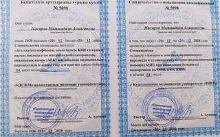 2019 — Кыргызский государственный медицинский институт имени С. Б. Даниярова, специализация «Стоматология»;