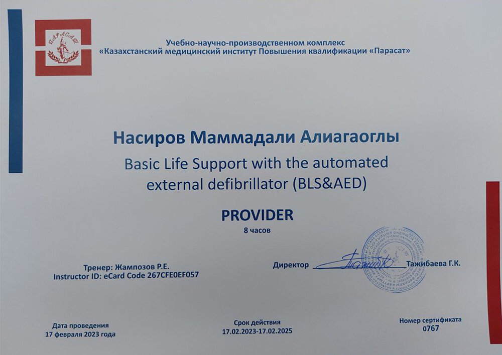 2023 — «BasicLifeSupportwiththeautomatedexternaldefibrillator (BLS & AED)», организатор Учебно–научно–производственный комплекс Казахстанский медицинский институт Повышения квалификации «Парасат», лектор Жампозов Р. Е., г. Алматы;