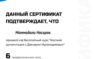 2022 — «Костная аугментация с Дамиром Мухамадиевым», организатор учебный центр «Master of Bone Augmentation», лектор Дамир Мухамадиев, MS.c., Dr. Med.dent, EAO, DICOI, г. Алматы;