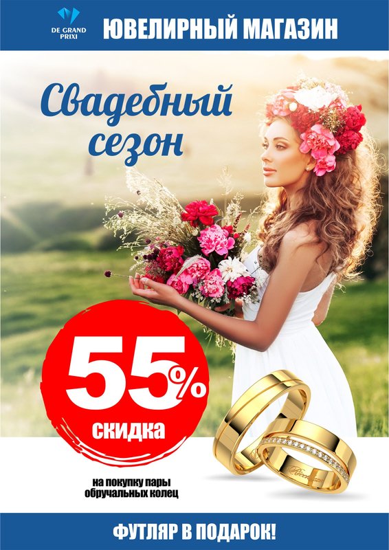 Скидка 55% на покупку пары обручальных колец Футляр в подарок!