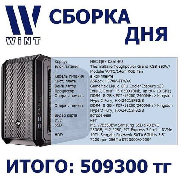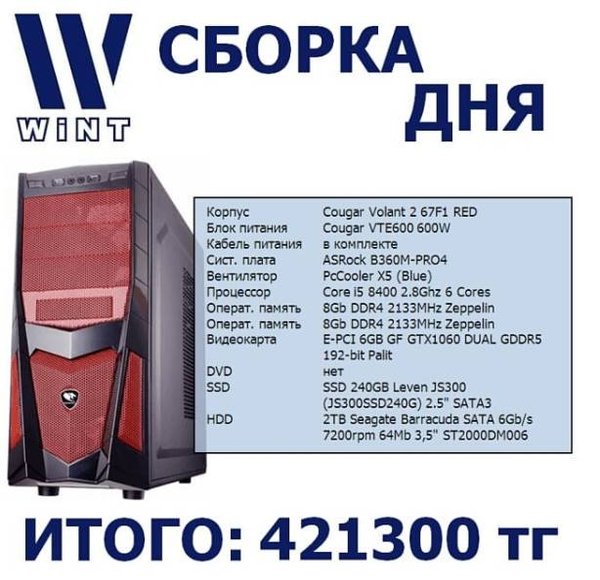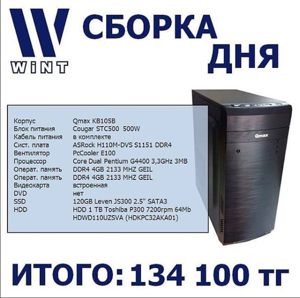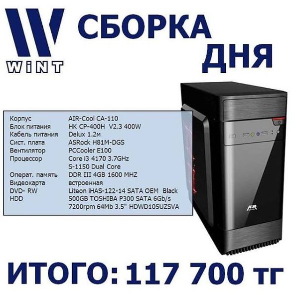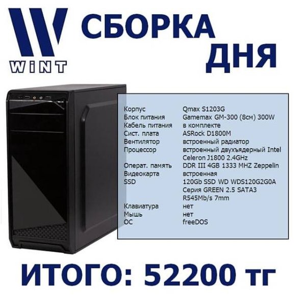 Сборка дня! Ищете хороший производительный ПК для работы в офисе или бухгалтерии? Нужен компьютер для учёбы? Вот то, что вам надо! Характеристики: Корпус Wintek K310 Блок питания 450Вт Материнская плата Asus PRIME H610M-R D4-SI Вентилятор для процессора ID-COOLING DK-01 Процессор Intel Core i3 12100 3.3 GHz Модуль памяти 8Gb DDR4 3200MHz Накопитель SSD 256GB Apacer AS2280P4 M.2 151 000 тенге — ВИНТ — с нами выгодно!