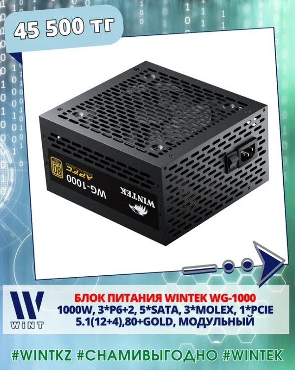 Блок питания Wintek WG-1000 рассчитан на мощность 1000 Вт и предлагает высокий уровень гибкости благодаря полному модульному дизайну. ️ Wintek WG-1000 поддерживает разъёмы 20+4 для материнской платы, две группы CPU 8-пин (4+4), три разъёма 6+2-pin PCIe, пять вывода SATA и три MOLEX. Также он оснащён выходом PCIE версии 5.1 (12+4). Сертификация 80 PLUS Gold обеспечивает высокий КПД, сводя к минимуму потери энергии. Благодаря полной модульности можно подключать только нужные кабели, что улучшает воздушный поток и упрощает укладку в корпусе. 4… — Читать дальше