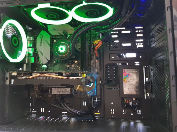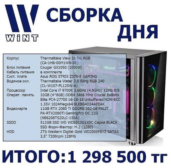 Геймерский системный блок за 1 200 000 тенге. Корпус Phanteks Evolv X Glass Блок питания Corsair HX850W Процессор Intel i9—9900K Водяное охлаждение Corsair HI150i Pro Системная плата ASUS Strix Z390E Gaming ОЗУ Patriot Viper 8GBx4 (3000Mhz) SSD Samsung 970 Evo 1TB SSD WD Blue 2TB Видеоадаптер Aorus RTX 2080 Extreme Вентиляторы Corsair LL120 RGB x3 Вентилятор Corsair LL140 RGB Кастомная плата V1tech Backplate — 1 200 000 тенге — Наши адреса - ул. Сағадат Нұрмағамбетов Орджоникидзе, 4, 240—241 пр. Ауэзова, 39, 25… — Читать дальше