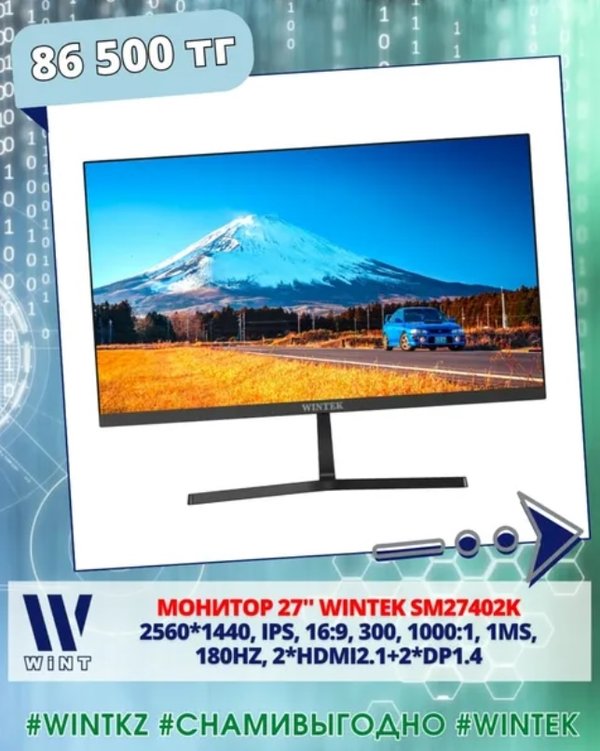 глы обзора до 178°. Частота обновления: 180 Гц — плавное изображение без разрывов, идеально для динамичных игр и работы с анимацией. Время отклика: всего 1 мс — моментальный отклик для чёткого изображения в любых сценариях. Яркость и контрастность: 300 нит и соотношение 1000:1 обеспечивают насыщенные и контрастные цвета. Интерфейсы: два HDMI 2.1 и два DisplayPort 1.4 позволяют подключить несколько устройств одновременно. 86 500 тенге — ВИНТ — с нами выгодно!
