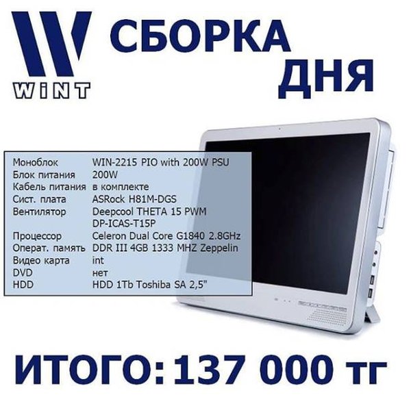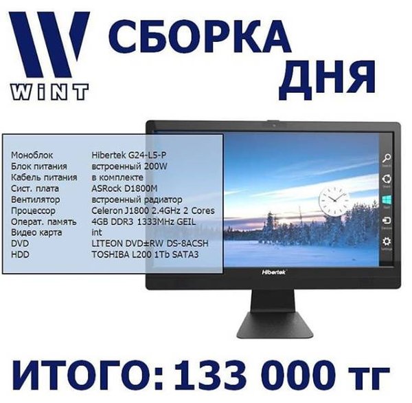 ения для процессора поставляется в комплекте с моноблочной системой. Дисплей: 27-дюймовый IPS экран с Full HD разрешением (1920×1080), который обеспечивает широкие углы обзора, яркие цвета и чёткие детали. Подставка: эргономичная конструкция позволяет регулировать высоту и поворачивать экран в портретный режим, что повышает удобство работы. Материнская плата: современная MB H610 с поддержкой процессоров Intel 12 и 13 поколения и оперативной памяти DDR4. Коммуникации: встроенные двух диапазонный Wi-Fi и Bluetooth для стабильного беспроводного соединения, гигабитный сетевой адаптер. Дополнительно: встроенная веб-камера, кардридер и стереодинамики. Комплектация: проводные клавиатура и мышь идут в подарок, что делает комплект готовым к использованию сразу после распаковки. Блок питания: надёжный 220-ваттный блок HuntKey обеспечивает стабильную работу системы. 170 200 тенге — ВИНТ — с нами выгодно!
