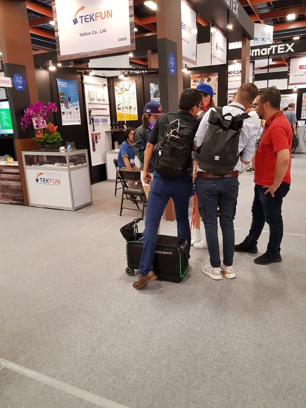 Будущее уже наступило. Чемодан на колёсиках теперь с рулём и двигателем. Я бы взял по выставке кататься.