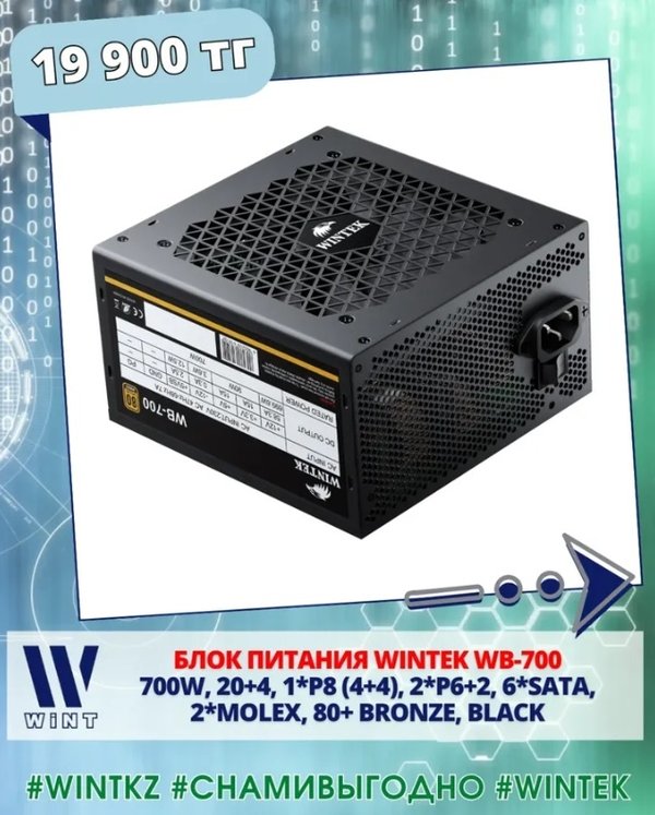 ии. Для подключения компонентов предусмотрен полный набор кабелей: 20+4 pin для материнской платы, 4+4 pin (P8) для процессора, два PCI-E 6+2 pin, шесть SATA и два Molex. Конструкция немодульная, что делает устройство более надёжным и простым. Защита представлена несколькими системами: от перенапряжения (OVP), пониженного напряжения (UVP), перегрузки по мощности (OPP), короткого замыкания (SCP) и по току (OCP). Дополнительно реализована EMI-фильтрация и схема DC-DC преобразования для точной стабилизации линий. Wintek WB-700 станет оптимальным выбором для игровых и рабочих сборок среднего класса, где важно сочетание стабильности и функциональности. Устройство уверенно справляется с нагрузками и помогает продлить срок службы компонентов системы. 19 900 тенге — ВИНТ — с нами выгодно!