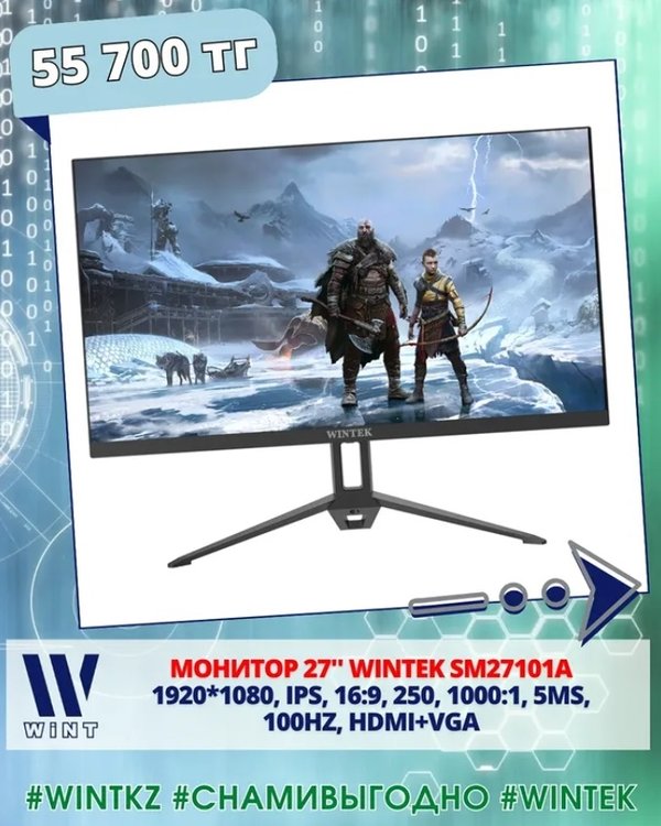 беспечивает яркую и насыщенную картинку даже при хорошем освещении. Контрастность: 1000:1 — подчёркивает детали как в тёмных, так и в светлых сценах. Частота обновления: 75 Гц — плавное изображение в динамичных сценах, что делает монитор подходящим для игр и просмотра видео. Время отклика: 5 мс — минимизация задержек и размытий. Разъёмы и подключения: HDMI и VGA — универсальные интерфейсы для подключения к современным и более старым устройствам. 40 300 тенге — ВИНТ — с нами выгодно!