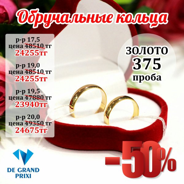 ОБРУЧАЛЬНЫЕ КОЛЬЦА из золота 375 пробы со СКИДКОЙ 50% При покупке двух колец — футляр в ПОДАРОК --- Срок акция ограничен ---