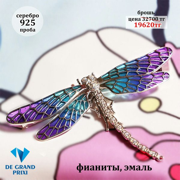 Летняя, яркая брошь 'Стрекоза', из серебра с фианитами и эмалью ---