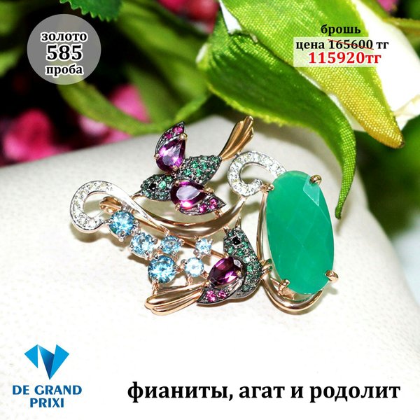 Летняя, яркая брошь, из золота с фианитами, агатом и родолитом --- РАССРОЧКА 0%, без переплаты ---