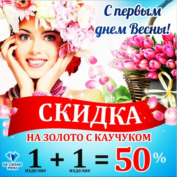 С первым днем Весны! Весна приносит обновленье, Улыбки, счастье и цветы ---- В сети ювелирных магазинов DE GRAND PRIXI МЕСЯЦ ВЫГОДНЫХ ПОКУПОК! ---- При покупке двух изделий из ЗОЛОТА с КАУЧУКОМ Вы получите СКИДКУ 50% ----