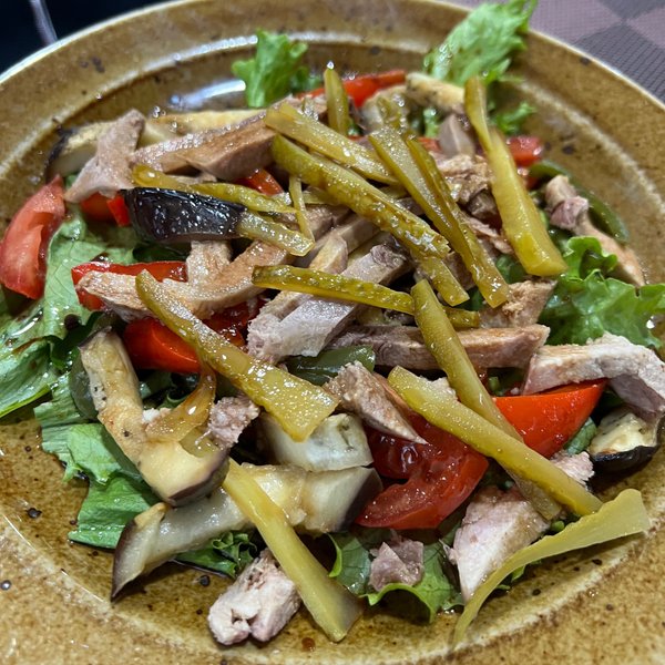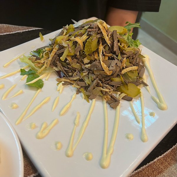 Салат «Печенег» — это сочетание говяжьей печени и ароматных грибов, яичного блинчика, хрустящих маринованных огурчиков, чесночка и майонеза. Однозначно рекомендуем к заказу!
