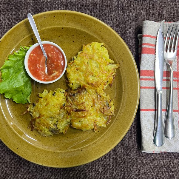 Постные драники с грибами — питательное и очень вкусное блюдо из картошечки, шампиньонов и лучка, подается с листом салата и соусом «сальса»