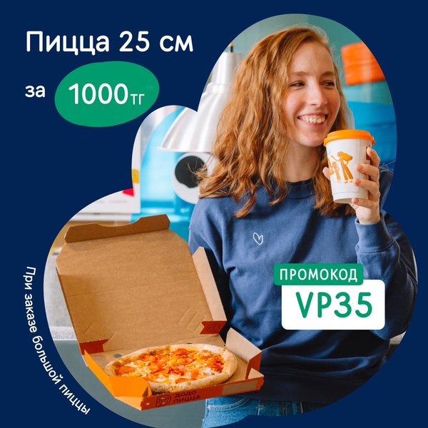 ДА, это случилось Теперь пицца 25 см стоит всего 1000 тенге при заказе любой большой пиццы ПРОМОКОД: VP35 А также, дарим скидку 20% на любой заказ от 6000 тенге ПРОМОКОД: VP20 Акции не действуют на комбо и добавленные ингредиенты, не суммируются с другими акциями. Успей воспользоваться в ресторане, на доставку или самовывоз до 12 апреля —