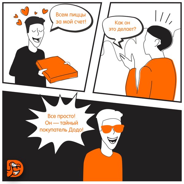 До сих пор ищете промокоды на пиццу? Забудьте об этом, ведь её можно получить бесплатно 1. заполняете анкету и становитесь тайным покупателем Додо Пиццы; 2. оформляете заказ и составляете отчет о качестве, сервисе и продукте; 3. получаете бонусы в двойном размере и оплачиваете ими пиццу. Уже 350 000 клиентов Додо Пиццы стали тайными покупателями и едят пиццу бесплатно. Заходите на и заполняйте анкету.