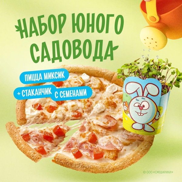мультсериалом мы запустили пиццу Миксик из четвертинок. В составе только то, что любят дети: цыплёнок, ветчина, томаты, кубики брынзы — и всё это с нежным соусом альфредо. После перекуса предлагаем заняться садоводством: с пиццей мы привезем специальный подарок от Копатыча — набор юного садовода. Ах да, выращивать растения можно еще и в «Саду Смешариков». Все подробности — в нашем мобильном приложении