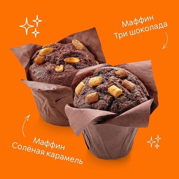 Осторожно, эти десерты бодрят дух! Если нет настроения, то они спасут ситуацию: – Маффин Три шоколада с начинкой из кубиков белого и молочного шоколада – Маффин Солёная карамель с изысканным сочетанием арахиса и карамели Уже попробовали оба вкуса?