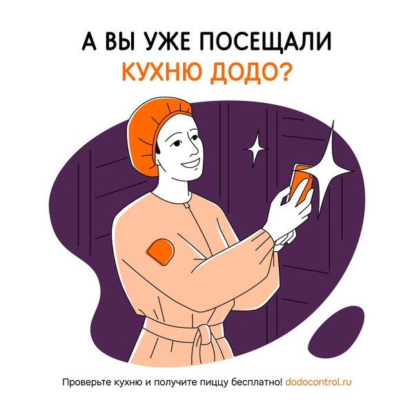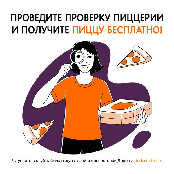 Каждый клиент может сделать свою пиццерию ещё лучше. Для этого нужно вступить в нашу секретную агентскую сеть Тайных покупателей и проверить стандарты в пиццериях Додо Пиццы. Каждому, кто проверит кухню и составит отчет, мы дарим 2 бесплатные пиццы.