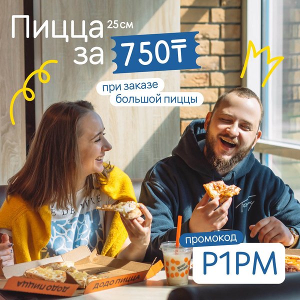 Cекретный способ купить маленькую пиццу за 750 тенге Просто добавь в корзину пиццу 35 см, а потом 25 см и введи промокод P1PM. Успей воспользоваться в ресторане, на доставку или самовывоз в нашем городе до 31 августа —
