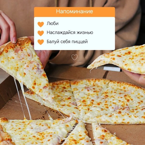 Егер бүгін сіздің жоспарларыңыз көшеге шықпау болса, біз бұл жауапкершілікті өзімізге аламыз! Сізге бір сағаттан артық емес ыстық пицца әкелеміз Айтпақшы, жеткізу тегін-кез-келген ауа-райы мен жағдайда _____________________ Если сегодня в ваши планы не входило выходить на улицу — берём эту ответственность на себя! Привезем вам горячую пиццу не больше чем за час Кстати, доставка бесплатная — при любой погоде и обстоятельствах