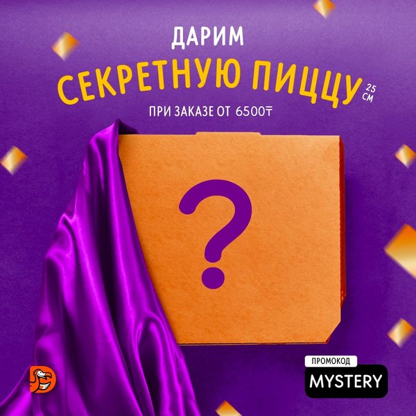 К заказу от 6500 тг подарим Секретную пиццу 25 см, промокод — MYSTERY. Не работает с другими акциями и комбо. Акция действует до 15 августа в нашем городе, поспешите воспользоваться!