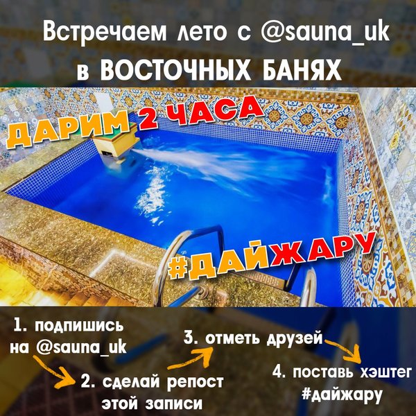 ‼Внимание! Конкурс! ‼ Для всех подписчиков Instagram мы объявляем о старте нового конкурса «Встречаем лето с @ sauna_uk»! Приз – 2 часа в наших Восточных банях! Все просто: Подпишись на наш профиль в Instagram @ sauna_uk. Сделай репост этой картинки к себе в аккаунт Отметь нас и 3-х своих друзей (тэг через @) В комментарии к репосту укажи хэштег #дайжару Каждому участнику будет присвоен порядковый номер. 1 июня в 17.00 с помощью генератора случайных чисел мы выберем победителя! Встреть лето в самом жарком месте в городе – Ба… — Читать дальше