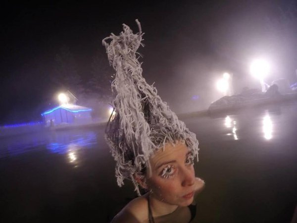 Конкурс замороженных причесок на канадских горячих источниках Тахини Каждый год на горячих источниках Тахини, в Канаде, проводится конкурс замерзших волос, где посетители соревнуются между собой, стараясь создать максимально необычную и смешную прическу из обледеневших волос