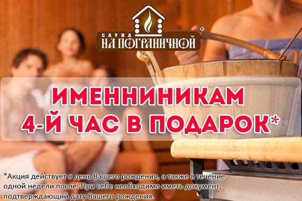 Дорогие друзья! Уникальное предложение для именинников! Мы дарим Вам бесплатный час сауны! Акция действует в день Вашего дня рождения, а также в течение одной недели после, при заказе от 3 часов и при предъявлении документа, подтверждающего дату Вашего рождения.